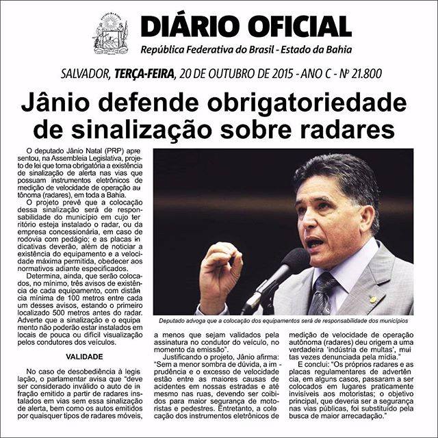 O Deputado Jânio Natal apresentou, à Mesa Diretora da Assembleia Legislativa, Projeto de Lei que torna obrigatória a existência de sinalização de alerta nas vias que possuam instrumentos eletrônicos de medição de velocidade de operação autônoma (radares), em todo o estado da Bahia.